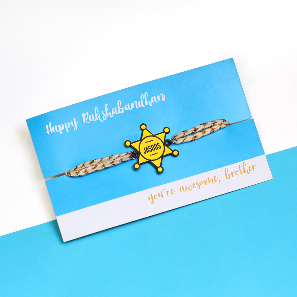 For the bro who is great at picking up clues, be it a surprise you're planning for him or figuring out what bothering you, we got you the perfect Rakhi - the Jasoos Metallic Rakhi. Treat your brother to something he will cherish long after the rakhi season is over with this quirky rakhi bracelet. With a brass sheet embellishment that depicts a detective badge with the words "Jasoos" on it, this is one fun rakhi for your detective bro.