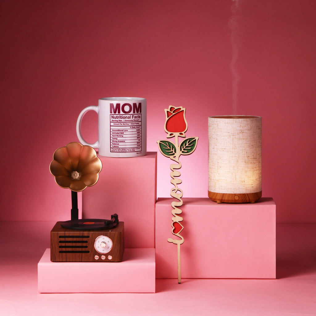 Package Includes:1 x I Love Mom Wooden Rose, 1 x Mom Nutritional Facts Mug, 1 x Retro Gramophone Bluetooth Speaker with Rotating Disc, and 1 x Bigsmall Zen Aroma Diffuser with Lamp