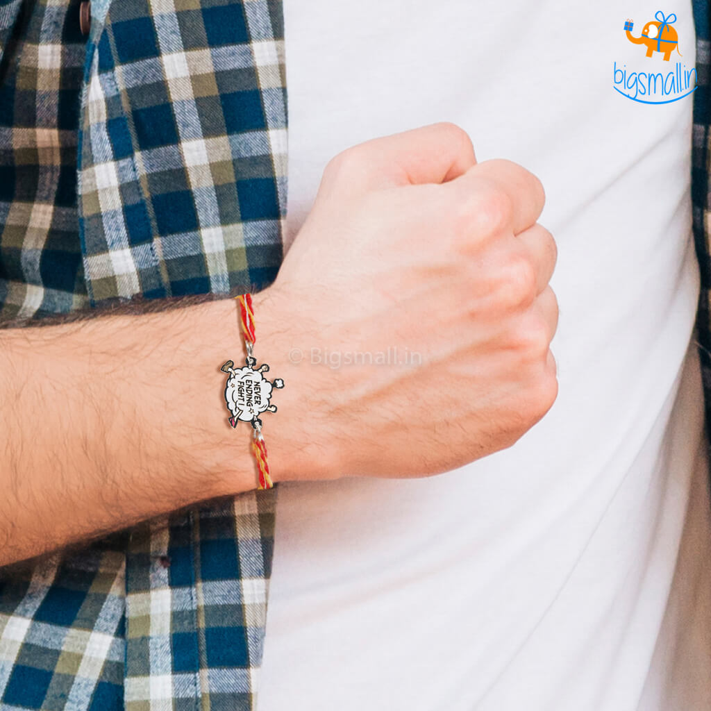 Grew up fighting with your brother? For good or for worse, it only brought you close together in the end. Fought for real or for fun, that time has shaped your relationship into what it is today. Maybe you still can't stop fighting and bicker for fun like old ladies. Celebrate this special bond this Rakhi season with this personality-specific Rakhi. Never-Ending Fight Rakhi that comes with a metal sheet embellishment in the shape of a cartoonish fight cloud with arms and legs sticking out.